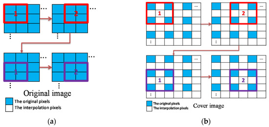 Recently, many RDH schemes based on the interpolated cover image were proposed [16,17,18,19,20,21,22,23,24,25,26,27,28,29,30], which can embed more secret data than traditional RDH methods while preserving a good visual quality of confidential images. The interpolation-based RDH scheme is especially useful for the application of medical image management. Since the visual quality of clinical images is directly related to the diagnosis, perceptible distortion is unacceptable. Therefore, it is more desirable to keep the original pixel value unchanged. The cover image is usually generated by upsampling with interpolation technology in the interpolation-based RDH method. Then, the confidential message is hidden into the interpolated pixels only. In this way, after extracting the confidential data, we only need to delete the interpolated pixels from the confidential image, and we can recover the primary image perfectly.