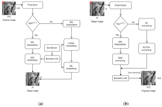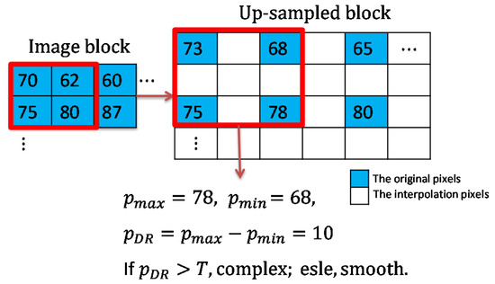 The dynamic range of the pixel values in each block is calculated as shown in Figure 4. When the dynamic range of a block is larger than the given threshold, we consider the block to be a complex block; conversely, it is considered to be a smooth block. Meanwhile, the original image is upsampled to obtain a cover image with spaces to be inserted for later use. The detailed processing for image upsampling and block classification is given in Algorithm 1. According to the type of the processing block, a specified interpolation method and embedding method are applied to hide the patient’s biometric information acquired by the biosensors. When a confidential image is received, the receiver first discriminates the block type and extracts the biometric data accordingly. After confirming the patient’s biometric information, the confidential image is downsampled to generate the original image. The overall flowcharts of the embedding and the extraction stages are given in Figure 5.