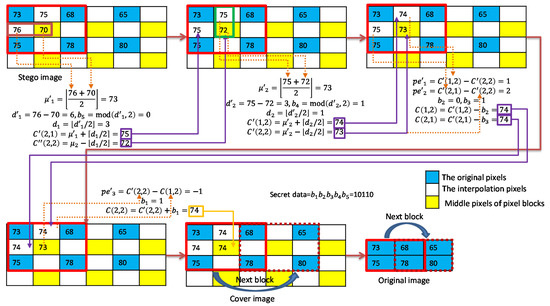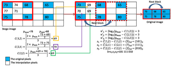 An example of data extraction for complex blocks is shown in Figure 8. The original interpolated pixel values , , and are calculated first. Then, the difference values with respect to are calculated to determine the payloads. Finally, the difference between each stego pixel value and original interpolated value is calculated and converted to binary bits according to its payload as shown in the figure.
