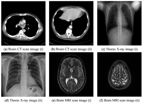 Six medical test images; (a) Brain CT scan image (i); (b) Brain CT scan image (ii); (c) Thorax X-ray image (i); (d) Thorax X-ray image (ii); (e) Brain MRI scan image (i); (f) Brain MRI scan image (ii).