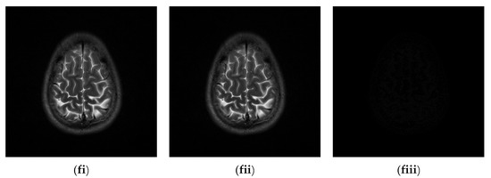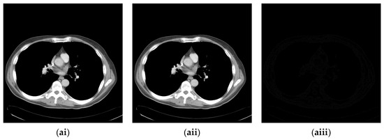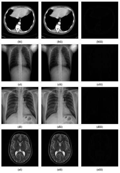 Since the interpolation-based RDH schemes are designed for the special purpose of embedding patient information into medical images, the performance of our proposed adaptive RDH scheme on medical images is the main concern. Figure 11 shows the original image and its corresponding confidential image with 2 bpp secret data embedded, and images showing the difference between the original medical images and their confidential images. The difference images (aiii–fiii) in Figure 11 show almost nothing, which indicates that the proposed scheme does not look much different from the original image after hiding and will not draw the eavesdropper’s attention.