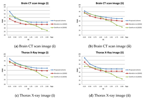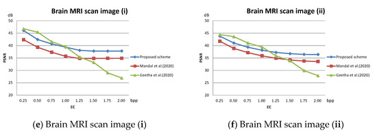 Comparison of PSNR on medical images; (a) Brain CT scan image (i); (b) Brain CT scan image (ii); (c) Thorax X-ray image (i); (d) Thorax X-ray image (ii); (e) Brain MRI scan image (i); (f) Brain MRI scan image (ii).