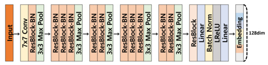 To extract the appearance features of objects, we use a modified ResNet-v2 network called LuNet [66]. The input of LuNet is an image patch. This network uses LeakyReLU [67] as an activation function for a robust optimization as shown in [68], multiple max-poolings with stride 2 instead of strided convolutions, and eliminates the final average pooling layer of feature-maps in the last res-block as depicted in Figure 2. From the multi-layer perceptron (MLP) layer of the last layer, we extract a 128-dimensional embedding feature of an object. This network is lightweight (5 M parameters) compared to other feature extraction networks (e.g., ResNet-50). We train this network with triplet loss [26] for learning discriminable features. We provide the details of our training method in the next section.