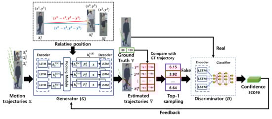 Our global relation motion model is trained based on the adversarial learning to understand distributions of various and relative motions. We explain the details of the adversarial learning in Section 5.1. Our model consists of two networks, the trajectory generator G and discriminator D. The generator G captures the distribution of the motion history and estimates future motions. The discriminator D computes the confidence score for ground truth trajectory or the predicted trajectory . We provide the detailed structures of G and D in Section 5.2.