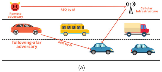 Figure 2 depicts a distant opponent in cyberspace (a). Opposing forces may be aware of the platoon’s path either before they arrive on the scene or as they go. An imposter car seems to be following them due to his use of the mobile phone network’s architecture. The same situation happens when the enemy is at a distance or ahead of the unit. The adversary does not target the verifier’s range sensors since he is presumed to be far away. The distance sensing technology may be safeguarded even in an assault using a secure ranging protocol [23,24,25].