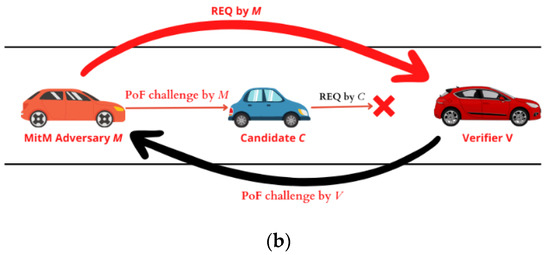 Man-in-the-middle adversary. An attacker can start a man-in-the-middle (MitM) assault while a legal candidate C tries to join the platoon. A MiTM assault is shown in Figure 2b. The opponent prevents the platoon from entering by intercepting C’s platoon entry request and replacing it with his own. M pretends to be the verifier to C at the exact moment. Using a PoF, the genuine verifier asks M to demonstrate that it is following the instructions. In the PoF protocol, C receives the identical challenge from an opponent.