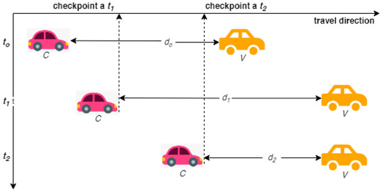 Candidate C’s responses to two tasks are shown in Figure 3. d0 = dref, C claims to be in follow-up with V at this exact point in time (to). The verifier determines the following vehicle’s distance and confirms that it is dref. A PoF, on the other hand, does not exist if another vehicle follows V. The verifier challenges C to meet deadlines t1 and t2 at checkpoints d1 and d2. C’s public key is used to encrypt the questions. A “CAVVPM” motion about the following distance dref is required for PoF verification. Due to time constraints, it is impossible for a remote attacker to complete the verification process. Relative ordering verification and lane verification may also be accomplished by aiming the range sensor immediately behind the verifier.