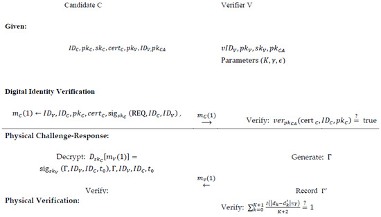 The procedure is divided into three stages: digital certificate verification, physical challenge–response, and physical verification. The person’s digital identification is validated in the first step. During the task phase, the verifier asks the candidate to make random movements and then measures the distance between them. The verifier approves the candidate’s claim if he reaches all checkpoints on time during the physical verification phase. As seen in Figure 4, each procedure step is described in detail.