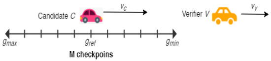 From S., a random checkpoint is picked for each task. We consider a verifier moving at UV = 30 m/s to illustrate the checkpoint selection procedure, as shown in Figure 5 and the simulation setting shown in Figure 6. We let , with a resolution of radar . Calculations are carried out by the verifier checkpoints that are 30 to 60 metres apart. For each candidate, a random checkpoint is selected from among the 51 available by the verifier.