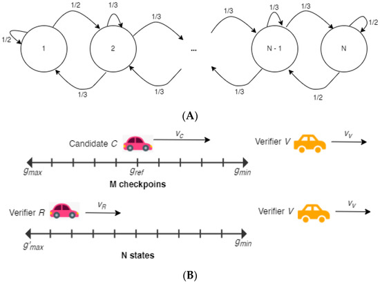 (A) Vehicle R’s Markov chain random walk model while (B) The verifier selects M checkpoints and R has N potential states.