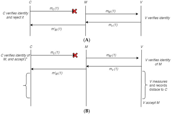The verifier authenticates the digital identity of M and challenges M with Γ after obtaining mM(1). Because the opponent is not following the platoon, the only way to effectively finish the MiTM assault is for the legitimate candidate to successfully complete the physical requirements. Γ. In response to C’s first communication mC(1), the adversary may try to transmit by:
