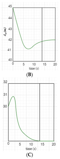 Shows the change in C’s acceleration, velocity, and distance from dref = 45 m to milestone D = 42 m when the verifier’s speed drops from 30 m/s to 27 m/s. (A) Acceleration; (B) Velocity; (C) Following distance.