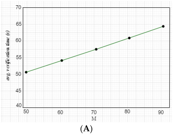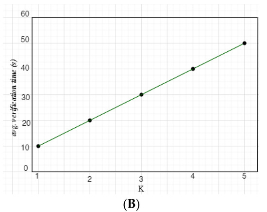 Time taken for verification in relation to physical difficulties K. Depending on how many physical challenges are presented by the verifier, verification time might vary significantly. Because the verification latency increases with each challenge, this connection should be linear. Variations occur because deadlines for randomly picked checkpoints are unpredictable. We experimented with K by setting the checkpoint space to M = 51 and running CAVVPM with various K values. Verification times and their standard deviations are shown in Figure 11A. Verification times have increased linearly as projected, with an overhead of around 10 s each physical challenge. Because the applicant will be platooning with the rest of the platoon for less than a minute, the verification period is rather brief. There are five checkpoints available, and the average verification time for each is shown in Figure 11B. The verification time rises as the candidate’s range of motion widens because the average distance to each checkpoint increases if and only if K equals 5. The method validation rises as the person’s motion widens because of the significantly larger range to every endpoint. Figure 12 depicts the candidate’s time-dependent acceleration, velocity, and following distance for a checkpoint 42 m from V.