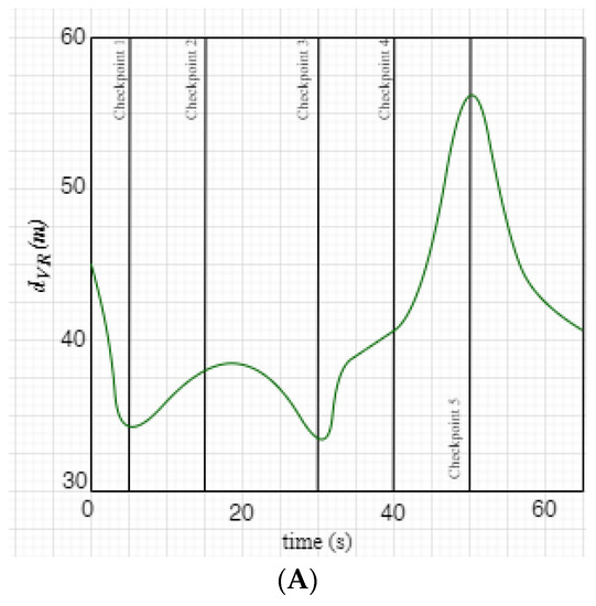 Investigating the ACC’s effects: The ACC settings control threshold deadlines. The vehicle’s speed is controlled by parameter 𝛾, in particular, concerning the checkpoint’s range. At a radius of 3 m from the dref, the checkpoint in Figure 8 indicates the person’s acceleration, speed, and the following field with time. Figure 8A shows that the vehicle’s starting speed progressively decreases until the milestone arrives when it stops. A virtually undetectable change in rate is demonstrated by the speed difference of 0.6 m/s (2 Km/h). In addition, we see a drop in speed and momentum difference with a longer delay until the checkpoint is reached once 𝛾 is reduced to 0.1. We used 𝛾 = 0.4 for the remainder of our runs. Figure 9 displays the Markov chain model, the verifier’s chosen checkpoints, and the N potential states for the vehicle R.