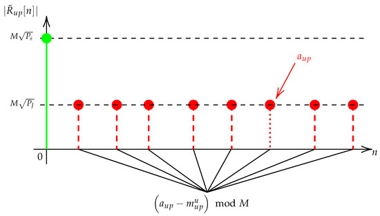 The modified DFT preamble upchirp waveform in the preamble is illustrated in Figure 4. The green DFT bin depicts the legacy format. It consists of a unique DFT bin at known location , containing all the signal power . The basic idea of the discrete scheme is to spread the power over several DFT bins with a uniform distribution in respect of a fixed power constraint. This is represented by the DFT bins with a dashed line in the figure. The modified preamble can be written as: