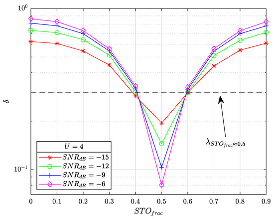 We can see from the figure that exhibit very good performance with a loss lower than 0.5 dB. Increasing U progressively degrades performance with a loss of about 3 dB for . This can be explained by the fact that the legacy cross-correlation is still used in the synchronization front-end with its U sensitivity (see Section 6), but also because of estimator limitation. If the preamble DFT peaks are too low, i.e., , will not be correctly estimated in a relatively high SNR. That is, the preamble DFT averaging performed straight afterwards will not perform well; and will then be incorrectly estimated, leading to a payload demodulation error. However, the value is more than sufficient to prevent E from correct demodulating, as explained in the next section.