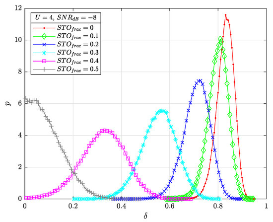 Figure 14 presents the impact of on average (denoted as ) and , respectively. We consider (a value giving very good SER performance for the legitimate receiver, as seen in Section 7.4), , with estimation residual and random . These values are the range in which E exhibits very good ER performance, as seen in Figure 12. In the simulation, E blindly estimates with the scheme presented in Section 5, and next performs the extraction of the DFT peaks with threshold to estimate . The estimated STO is compensated and E can finally proceed to the payload section of the frame.