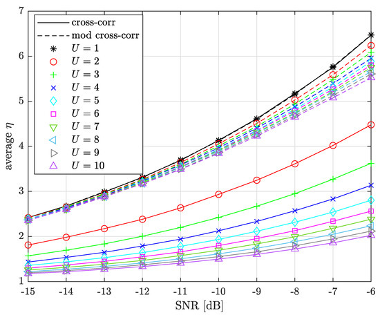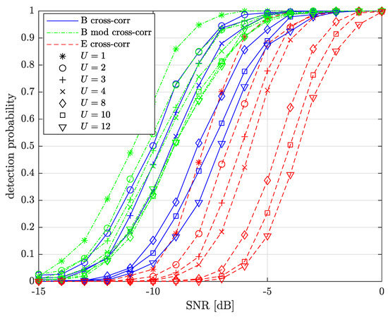 For , the legacy and modified cross-correlation schemes have similar preamble detection performance, with a slight advantage for the modified cross-correlation method. However, for higher U, the modified cross-correlation scheme progressively outperforms the legacy cross-correlation scheme as U grows, with a performance difference of about 2 dB and a detection probability of 0.5 and . Note that the modified cross-correlation performance is almost the same for .