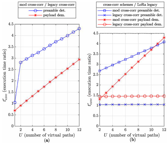In Figure 11a, the mod cross-corr/legacy cross-corr execution time ratios of the preamble detection and payload demodulation processes are presented for . We can see for and the payload demodulation considered that mod cross-corr is about faster than legacy cross-corr ( ). Indeed, mod cross-corr with is identical to the LoRa legacy demodulation scheme in (4). Then, computing the legacy cross-correlation for this case adds unnecessary complexity. Equally, when , the candidate procedure for preamble detection presented in Section 7.1 is useless, considerably decreasing the complexity, leading to a ratio . Activating the necessary candidate approach for greatly increases the complexity cost, reflected in the high ratio transition from 0.7 to 2.8 between to . Increasing U progressively increases the mod cross-corr complexity to reach a complexity increase factor of about 3 at .
