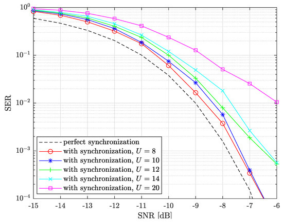 Figure 13 presents the SER performance of the legitimate receiver as a function of for several and . We also add the maximum performance reachable as the perfectly synchronized case with no self-jamming, i.e., .