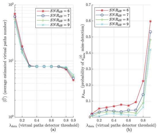 Eve blind payload demodulation performance as a function of for several SNR values and . (a): Average estimated virtual paths number. (b): Probability of miss-detection.