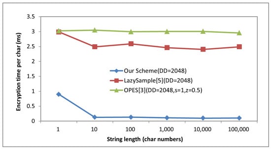 Figure 4 shows the relationship between single character encryption time Tch with different string length len for three algorithms when the definition domain is [1,2048].