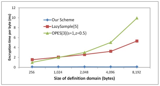 Order-preserving encryption scheme (OPES) [3,4] is also an effective scheme to support ciphertext comparison. In this scheme, the ciphertext preserves the natural ordering of the plaintexts, that is, if the x and y are known plaintexts and the encryption function is Enc (plaintext), then when x > y, there is Enc (x) > Enc (y). The OPES allows sorting, comparison, and range query of encrypted data on an untrusted outsourced server without requiring the server to obtain a decryption key. For example, in the health sensing system, in order to query the range of blood pressure (BP) (e.g., 60 < BP < 90), the server only needs to select all encrypted data between Enc (60) and Enc (90). Obviously, the OPES not only guarantees the data privacy, but also improves the efficiency of data query because the range query can be performed without decrypting the ciphertext.