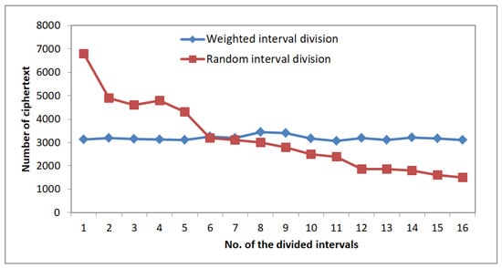 To count the frequency distribution of the encrypted results, we divided the definition domain into 20 same size sub-intervals and counted the number of encrypted value which dropped in different sub-intervals. Moreover, the experimental results are shown in Figure 7.