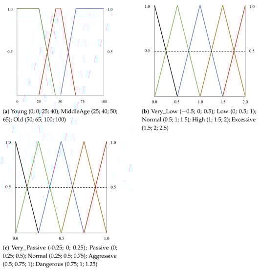 - Driver profile: the output variable of the fuzzy system. It represents the driver profile. For this variable, 5 equally spaced, triangular-shaped membership functions were defined. Figure 5c presents the membership functions and fuzzy sets defined for the driver profile. The driver profile is classified into five categories: Very Passive, Passive, Normal, Aggressive, and Dangerous.