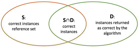The evaluation of the classification systems was carried out using MSE and also Precision, Recall, and F-Measure (F1), which represents accuracy and completeness [43]. MSE was computed using Equation (1), considering the membership degree values observed for the different fuzzy sets of the output variable and the expected values in the reference set. For the Precision, Recall, and F-measure calculation, we use the set of correct reference instances (S) and the set of instances returned by the algorithm as accurate (D), as seen in Figure 6.