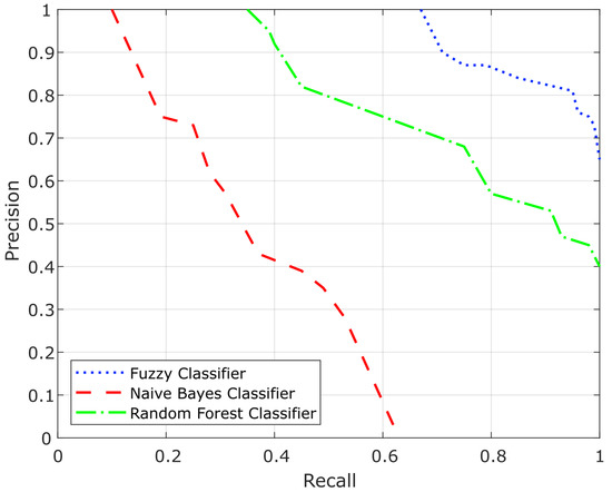 Figure 7 shows the precision–recall curves for the three methods. In the curves, we observe how the precision values decrease as the recall values increase. We can see that the Bayesian classifier yields the lowest values for precision and recall. This is due to the fact that this approach assigns 0 probability to the categories of the test variables which are not observed in the training data. This is a clear disadvantage of this approach compared to the random forest and fuzzy logic approaches. Another characteristic of the Bayesian classifier is that it assumes completely independent predictors. Although this implies that the Bayesian classifier requires little training data, it makes the model unrealistic, and it is a limitation that affects precision and recall.