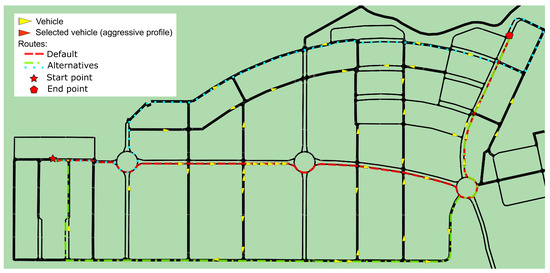 Finally, we compared the results obtained in both cases. Three sets of experiments were performed, varying the number of vehicles: the first in a range between 50 and 150 vehicles; the second between 150 and 300 vehicles; and the third between 300 and 500 vehicles. Figure 8 shows an example, with 50 vehicles located on the map. Vehicles are shown as yellow triangles, which indicate the direction of their movement. For a better understanding, we have chosen a specific vehicle, and we represent only the routes associated with the selected vehicle. The default route for this vehicle is represented by a red dashed lines (a red star represents the start point and a red pentagon represents the endpoint). Considering the level of congestion and the driver profile (aggressive in this case), the system suggests two alternative routes (blue and green dashed lines) to save time.