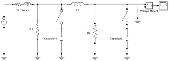 Simulink system for generating voltage oscillatory transient induced by capacitor switching.