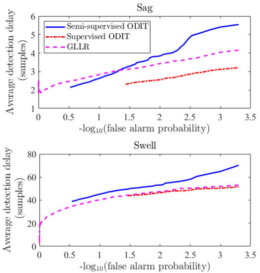In this section, we apply the proposed detector to the detection of the common voltage disturbances: sag, swell, and oscillatory transients. We evaluate our proposed detector in terms of the average detection delay versus the false alarm rate and compare it with the semi-supervised ODIT [28] and the GLLR method proposed for sequential PQD detection in [21].