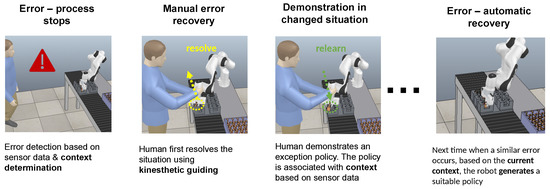 Recently, we have proposed a framework for the learning of exception strategies [6], which is based on determining the context of the failure. The extracted context is associated with different robot policies needed to resolve the cause of the error. In the event of an error, the system stops, and the robot switches to gravity compensation mode. Using incremental kinesthetic guidance [7], the operator performs a sequence of movements to allow the continuation of regular operation. First, the robot builds a database of corrective actions and associates them with the detected error contexts. Then, using statistical methods, it computes an appropriate action by generalizing the corrective actions associated with different error contexts. In this way, the robot becomes increasingly able to resolve errors on its own and eventually does not require human intervention to resolve assembly failures anymore (see Figure 1).