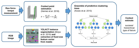 We propose to train models that generate low-dimensional context descriptions based on multimodal sensor data from vision systems and force-torque sensors. In this sense, context determination can be defined as determining of the type of circumstances from multimodal data. We use an intermediate-fusion approach, where we first extract modality-specific features, as shown in Figure 2. We rely on a state-of-the-art neural network model for image segmentation to extract features from images, whereas we use contact point estimation to extract data from the measured forces and torques. To generate a low-dimensional context description of the circumstances that resulted in the given outcome from the extracted features, we use ensembles of predictive clustering trees (PCTs) [10], which are well suited for handling hierarchical multi-label classification (HMLC) tasks. With the proposed hierarchical approach, the training of the context estimation model can be divided into multiple phases, allowing for an incremental approach. The time-consuming training of the image segmentation model only needs to be performed once, whereas fast training of the high-level ensemble model can be performed each time a new class needs to be added.