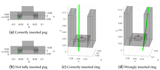 When inserting a sliding ring into the casting mold, there are two major types of errors. The first type is when the base of the ring is not properly seated into the model (see Figure 5 middle). This type of error mainly arises due to imprecise grasping or due to errors in the target position. The second type of error occurs when the sliding ring is deformed. Both types of error can be reliably determined by using the proposed approach. We first displaced the target position by 2 mm in the negative y direction so that the insertion failed. As the exception strategy for this case has not yet been programmed, the operator demonstrated how to resume the operation and resolve the issue using iterative kinesthetic guidance [7]. When the target was displaced by the same offset again, the robot was able to resolve the problem. We also started the insertion procedure with a deformed part. It was correctly determined, and the robot placed it into the bin for deformed parts. An example video of both experiments can be found in the Supplementary Materials.