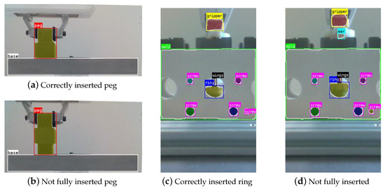 The results are shown in Figure 8. The PiH model is trained to distinguish between the peg and the base plate, whereas the copper ring insertion model is able to distinguish the following segments: gripper, mold, screws, ring base, wings, and ears (lugs).
