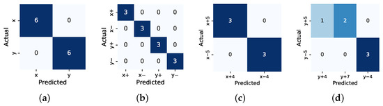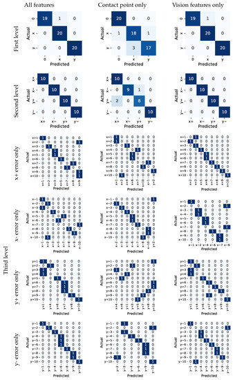 The results for the copper ring insertion task are given in Figure 14. Similar to before, we found that the model performed best when all features were included. For the model that uses all features, the overall classification accuracy at the first two hierarchical levels was 0.88. For the third level, the overall classification accuracy was 0.81. For error classes in x direction, the classification accuracy is 0.67, and 0.9 for y direction. For the model that only uses features from the vision modality, the overall classification accuracy at the first two hierarchical levels dropped slightly to 0.85. The overall classification accuracy at the third level was 0.62, and 0.5 and 0.6 for the x and y directions, respectively. The drop was even more pronounced when evaluating the model that only uses features from the FT modality. The overall classification accuracy at the first level was 0.81 and at the second and third it was 0.77, whereas it was 0.58 and 0.9 for the x and y directions, respectively. When comparing the results of the vision- and FT-features-only models, it is evident that while the earlier achieved a higher overall accuracy, the latter achieved higher accuracy when distinguishing among different magnitudes of error in the y direction.