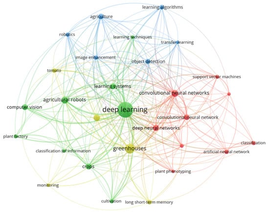 Table 1 presents the existing review articles covering DL applications in different sections of agriculture [,,,,,,]. From the table, it is evident that the reported studies (based on the authors’ knowledge) lacks a critical overview of recent advancements in DL methodologies for CEA. Thus, a need to review the recent works in CEA is consequential to determine state of the art, identify current challenges, and provide future recommendations. Figure 1 shows the bibliometric network and co-occurrence map of the author-supplied keywords.