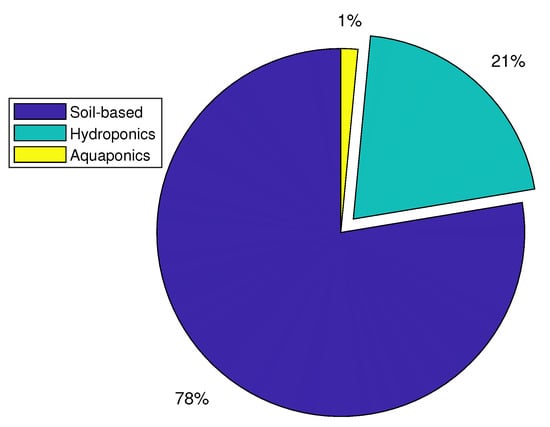 Sustainable access to high-quality food is a problem in developed and developing countries. Rapid urbanization, climate change, and depleting natural resources have raised the concern for global food security. Additionally, the rapid population growth further aggregate the food insecurity challenge. According to World Health Organization, the food production needs to be increased by 70% to meet the food demand of about 10 billion people by 2050 [], of which about 6.5 billion will be living in urban areas []. A significant amount of food is produced in the open fields using traditional agricultural practices, which results in low yields per sq. ft of land used. Simply increasing the agricultural land is not a long-term option because of the associated risks of land degradation, de-forestation, and increased emissions due to transportation to urban areas []. Thus, alternative production systems are essential to offset these challenges for establishing a sustainable food supply chain.