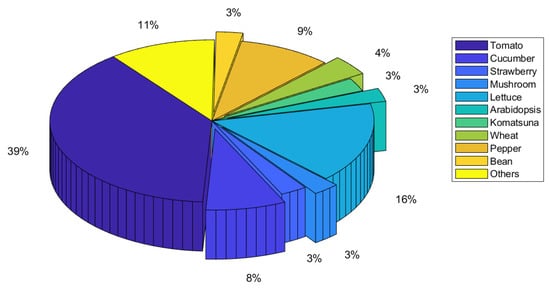 Disease control in greenhouse environments is one of the most pressing issues in agriculture. Spraying pesticides/insecticides equally over the agricultural area is the most common disease control method. Although effective, this approach comes at a tremendous financial cost. Techniques for image recognition using DL can dramatically increase efficiency and speed while reducing recognition cost. As indicated in Table 3, we only identified various diseases of tomato and cucumber based on our assessments of the evaluated publications. As indicated in Table 3, we identified various diseases of tomato such as powdery mildew (PM) in [,,], early blight in [,,], leaf mold in [,,], yellow leaf curl [,], gray mold in [,], spider mite in [] and virus disease in []. Similarly, the diseases of cucumber such as powdery mildew (PM) in [,,], downy mildew (DM) in [,,,] and virus disease in [] are the sole diseases discussed based on our assessments of the evaluated publications. The wheat disease stated in [] is another disease reported in the examined articles.