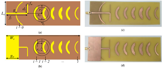 To compose the multi-sector BS antenna architecture proposed in this paper (Figure 1b), the microstrip Quasi-Yagi antenna developed by the authors in [20] has been considered. The detailed layout of the Quasi-Yagi antenna and a photography of a produced prototype are depicted Figure 2. The antenna is based on the Quasi-Yagi principle where etched parasitic elements with a waning crescent shape are employed as the directors and reflector [22]. The antenna is then composed of a microstrip dipole as the driven element, a waning crescent reflector over a ground plane, and six optimized waning crescent directors. The waning crescent-shaped directors follow the format of a quarter of a circle centered at (Figure 2a). The frequency of operation is defined by the dimensions of the dipole arms (), while the feeding line width () and length () dictate the input impedance of the antenna. The antenna was designed in a double-sided FR4 substrate with , a tan and a thickness of mm, and it has total dimensions of mm.