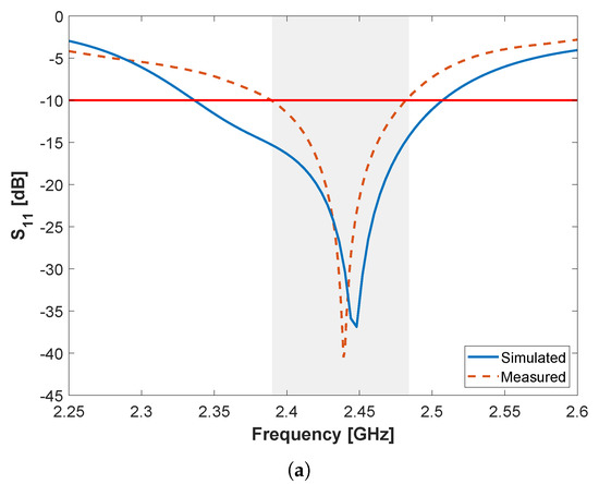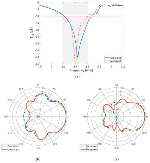 To further validate the model, the proposed microstrip Quai-Yagi antenna has been fabricated and experimentally characterized in laboratory environment using the experimental setup detailed in Section 3. In particular, antenna matching (-parameter) and radiation patterns in the two main antenna planes (i.e., azimuth and elevation) have been measured inside an anechoic chamber and compared to the simulation results previously presented in [20]. From the -parameter, depicted in Figure 3a, it is possible to observe that the measured results are in good agreement with the simulated ones, with the resonance peak present at 2.39 GHz. The antenna matching is below −10 dB between 2.15 and 2.53 GHz, presenting a bandwidth of 380 MHz, in experiments, against a slightly larger bandwidth of 450 MHz in simulations. Such discrepancy can be associated to mismatched values of the permittivity of the substrate between the real data and the one provided by the manufacturer, accuracy issues associated with the PCB production technique (produced in-house), and the use of the SMA connector, which was not considered in the simulations.