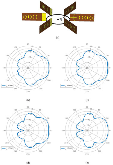 Study of the impact of the adjacent antennas in radiation performance: (a) simulation model in CST MWS; simulated radiation patterns in azimuth plane for: (b) = 5 cm, (c) = 6 cm, (d) = 7 cm and (e) = 8 cm.