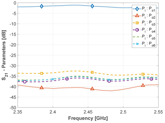 Accordingly, six equal waning crescent Quasi-Yagi antenna prototypes were constructed and displaced in a circular fashion, as depicted in Figure 5, with the assistance of a 3D-printed structure made of polylactic acid (PLA). All the fabricated antennas have been experimentally characterized to be aware of any performance discrepancy between prototypes. In order to implement the sector selection technique, a “SKY13418-485LF” RF-switch was used as a multiplexing mechanism. This 8-port switch operates from 0.1 to 6.0 GHz, and the active output is selected via digital pins (3-bits). However, as only six sectors are being considered in the proposed assembly, the remaining ports are terminated with a 50 load. With the objective of characterizing the RF switch, the insertion loss and isolation between ports were measured between the input port () and all other remaining output ports (). The 5 cm RF cables used between the switch and antennas are also taken into account. The results, depicted in Figure 6, are in good agreement with the data sheet given by the manufacturer with a typical isolation between ports >30 dB and average insertion loss around 1.7 dB within the 2.4 GHz ISM band.