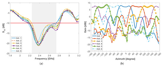 Finally, the prototype of the base station was also experimentally characterized inside the anechoic chamber. This would allow us to assess the impact of the adjacent antenna elements in the performance of the array. Figure 7 depicts the measured and radiation pattern in the azimuth plane, for every array element, while the remaining ones are set to the OFF state (adapted at 50 ). According to the results, the overall of the multi-sector BS presents a useful bandwidth of 500 MHz, defined between 2.24 and 2.74 GHz, as depicted in Figure 7a, still respecting the initial project requirements. However, the radiation pattern in the azimuth plane (Figure 7b) presents a slight deformation of the main lobe, which is associated with the spacing between elements of the array, as predicted by the simulations of Figure 4. This effect could be attenuated by increasing the diameter of the circular array at the expense of undesirably increasing the volume of the antenna.