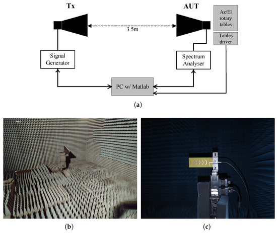 Radiation pattern measurement setup: (a) block diagram; (b) photography of Tx antenna and (c) close up an AUT, inside the anechoic chamber.