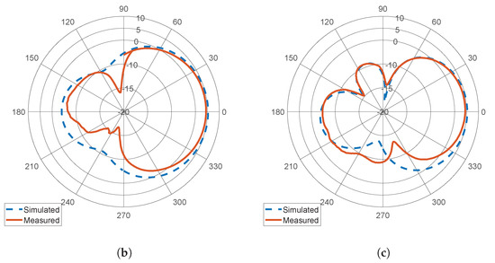 In regard to the radiation pattern obtained at 2.45 GHz, depicted in Figure 3b,c for the azimuth and elevation planes, respectively, we can observe a good agreement in the shape between the simulation and measured results. According to experiments, the antenna presents a maximum gain of of 8.9 dBi, an HPBW of 60 in azimuth and 54 elevation planes, respectively, and a back-to-front ratio of 21.2 dB. This compares to simulations by having a decrease of 0.5 dB in total gain and 1 dB in back-to-front ratio.
