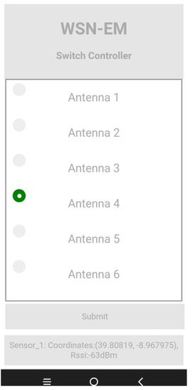 With the purpose of controlling the RF switch and the respective active BS sector and monitoring the WSN, a user interface was developed. The user interface is available only when connected to the closed network, and it can be accessed via web browser. A screenshot of the interface is depicted in Figure 12. The interface was developed in HTML and CSS, reducing the usage of the memory resource. To handle the communication between the devices, the http protocol is used. The BS creates a socket defining itself as the web server, while the remaining devices (nodes, user device) are clients. When the user creates a request in the socket (“GET”), the BS responds with a string that contains all the information for the user interface site. To change the active antenna, the user simply selects the antenna to be active and clicks the “Submit” button. The interface also informs the user of the last data received on the BS, as shown in the bottom of the site, listing the node identification, current coordinates and its RSSI. Several other pieces of information such as temperature, humidity, air pressure and others can also be added to be shown in the user interface.